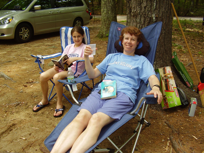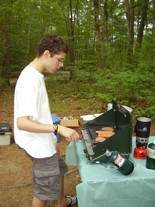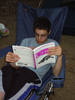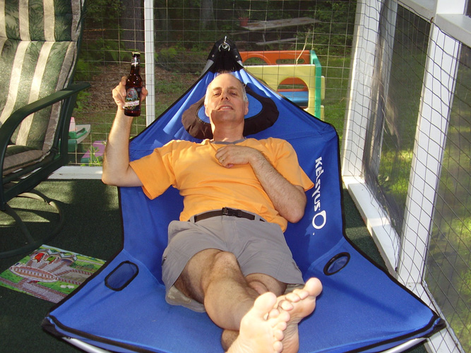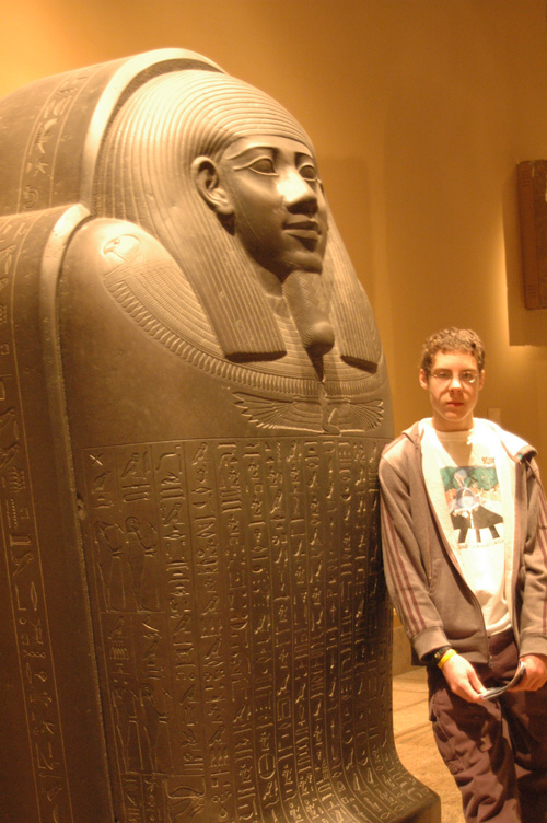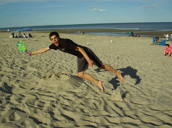 The pictures below show me: standing next to a sarcophagus at the Metropolitan Museum in NYC, reading a computer book in the fading light on a family camping trip, cooking dinner for the family, and doing an awesome move during a beach racket game.